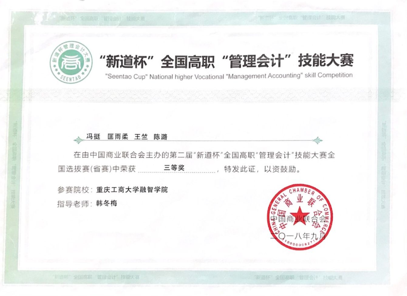 [4]陈潞,新道杯全国高职管理会计技能大赛,荣获市级三等奖,2018