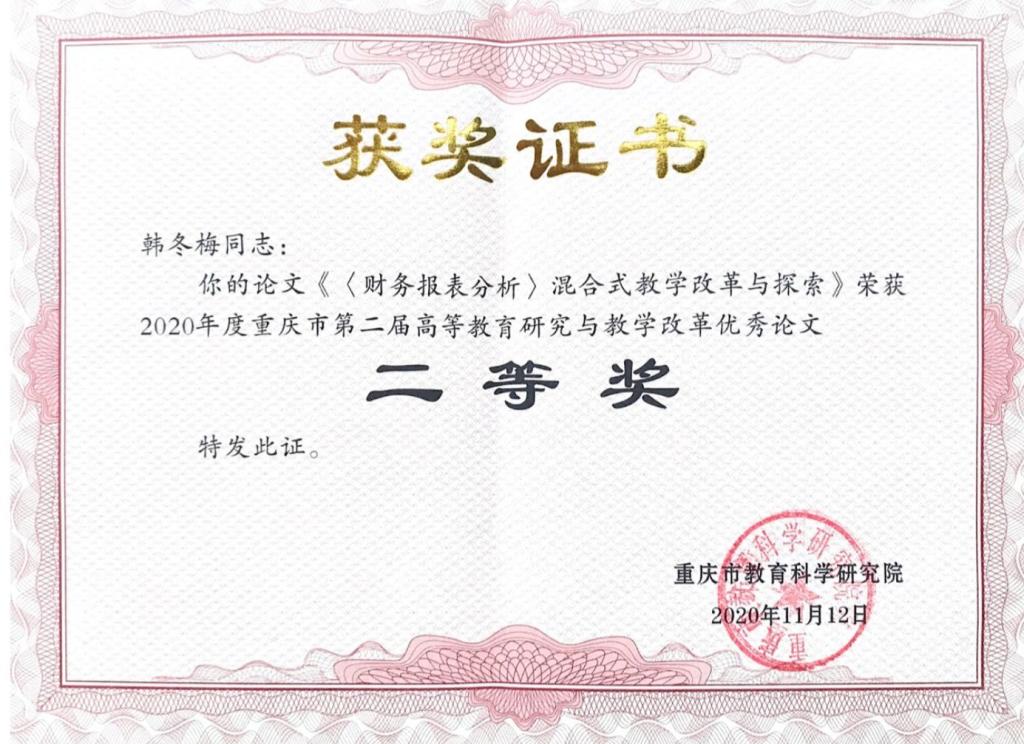 [5]重庆市第二届高等教育研究与教学改革优秀论文二等奖,2020;
