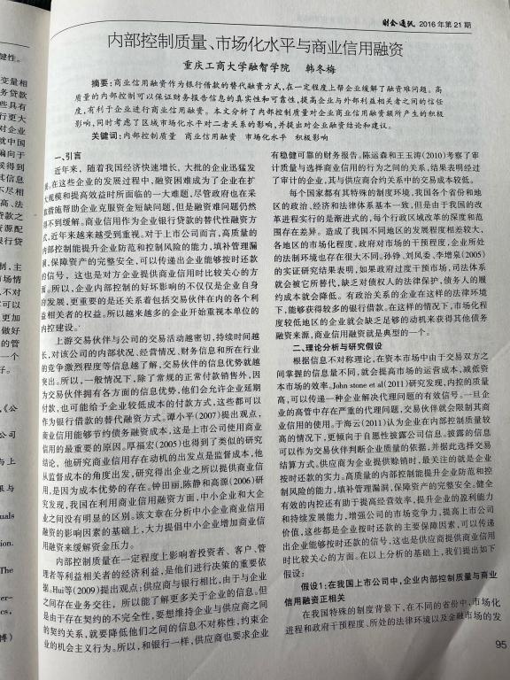 [1]内部控制质量、市场化水平与商业信用融资,财会通讯,1排1,2016;