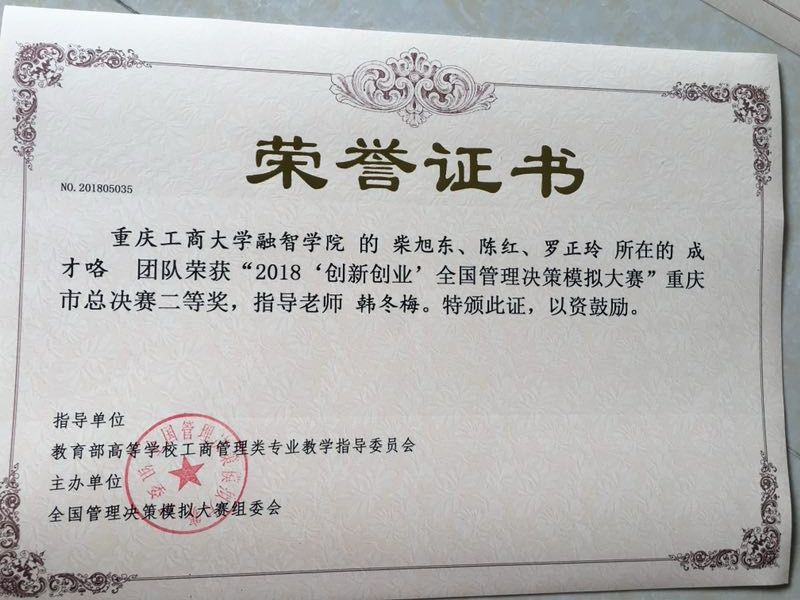 [6]柴旭东,2018创新创业全国管理决策模拟大赛,荣获市级二等奖,2018;