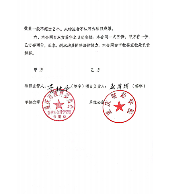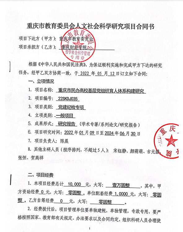 4.重庆市教育委员会:重庆市民办高校基层党组织育人体系构建研究,2022.5.12——2024.6.30,主研,排名5/6