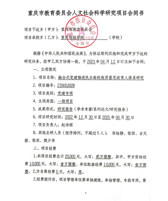 3.重庆市教育委员会:融合式党建推进民办高校高质量思政育人体系研究,2023.04.02——2025.06.30.主研,排名3/6