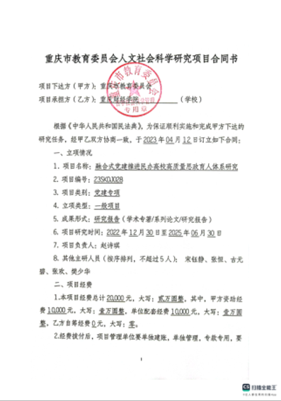 1.重庆市教育委员会一般项目:融合式党建推进民办高校高质量思政育人体系研究,2023.04-2025.06,主持,排名3/6