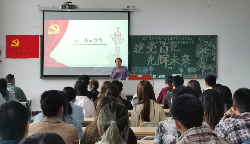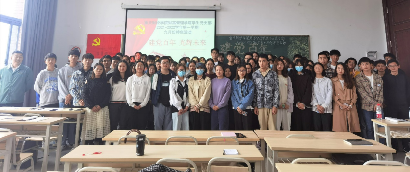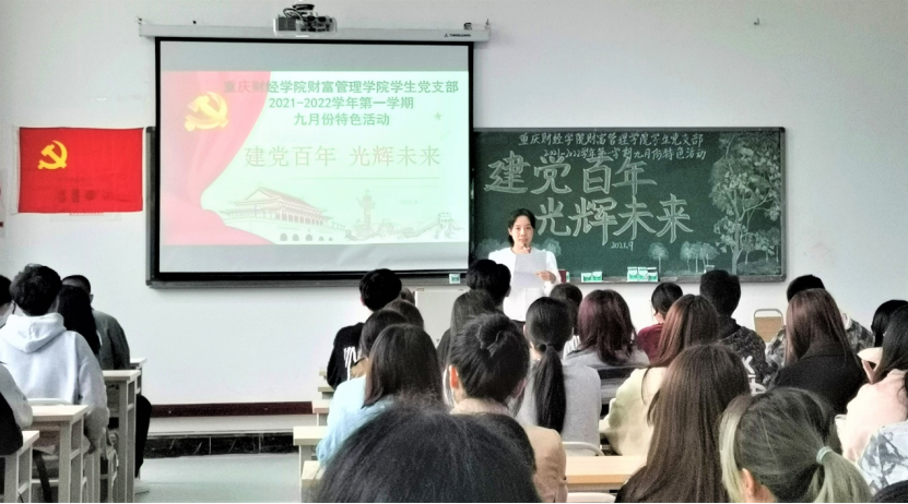 为继承和发扬革命先辈红色精神,增强党员的党性观念。重庆财经学院财富管理学院学生党支部于2021年9月13日中午12:20在教学楼1614教室开展以“建党百年,光辉未来”为主题的九月份特色活动。参加本次特色活动的有财富管理学院代理学生党支部书记古元碧老师、全体学生党员以及党员服务站全体工作人员。活动由金佳妮同学主持。